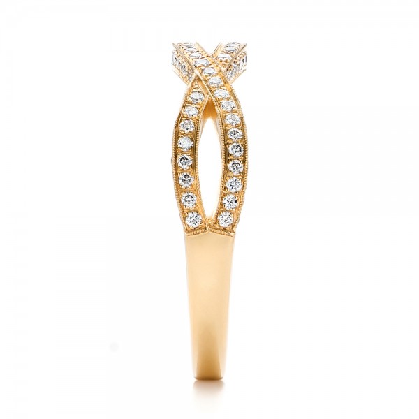Glistening streams swirling with diamonds characterize this beautiful ring uniquely crafted in an overlapping design of lustrous 14-karat yellow gold. A stunning look for everyday. Baguette cut diamonds are channel set to accentuate their sparkle. Diamonds have a total weight of 0.25 ... View Video
